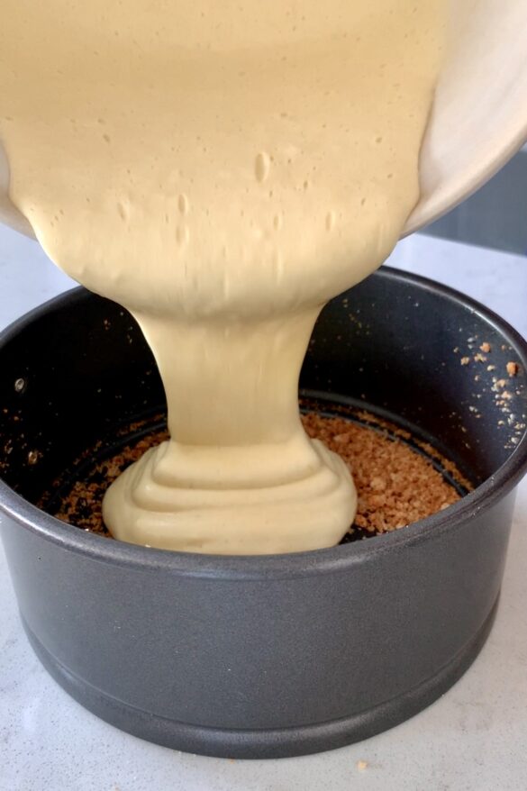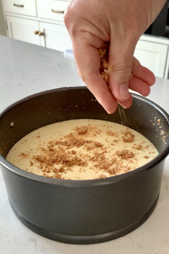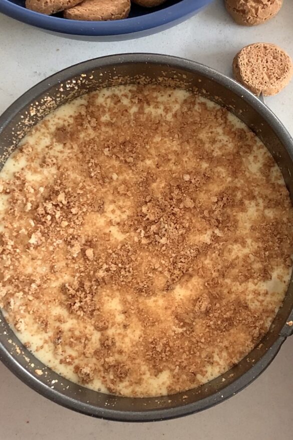 - Giet het beslag in de springvorm en strooi de andere helft van de verkruimelde amaretti koekjes erover.