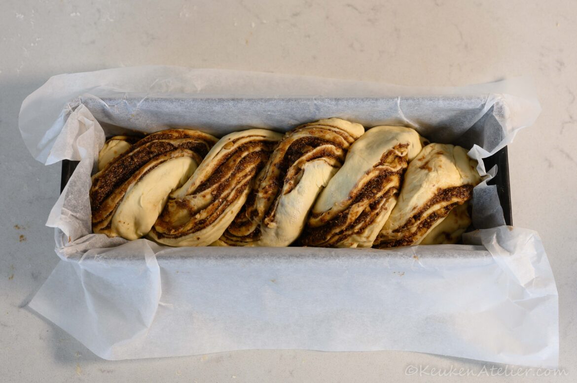 - Bekleed de cakevorm met bakpapier. Hierdoor is de babka na het bakken makkelijk uit de vorm te krijgen.