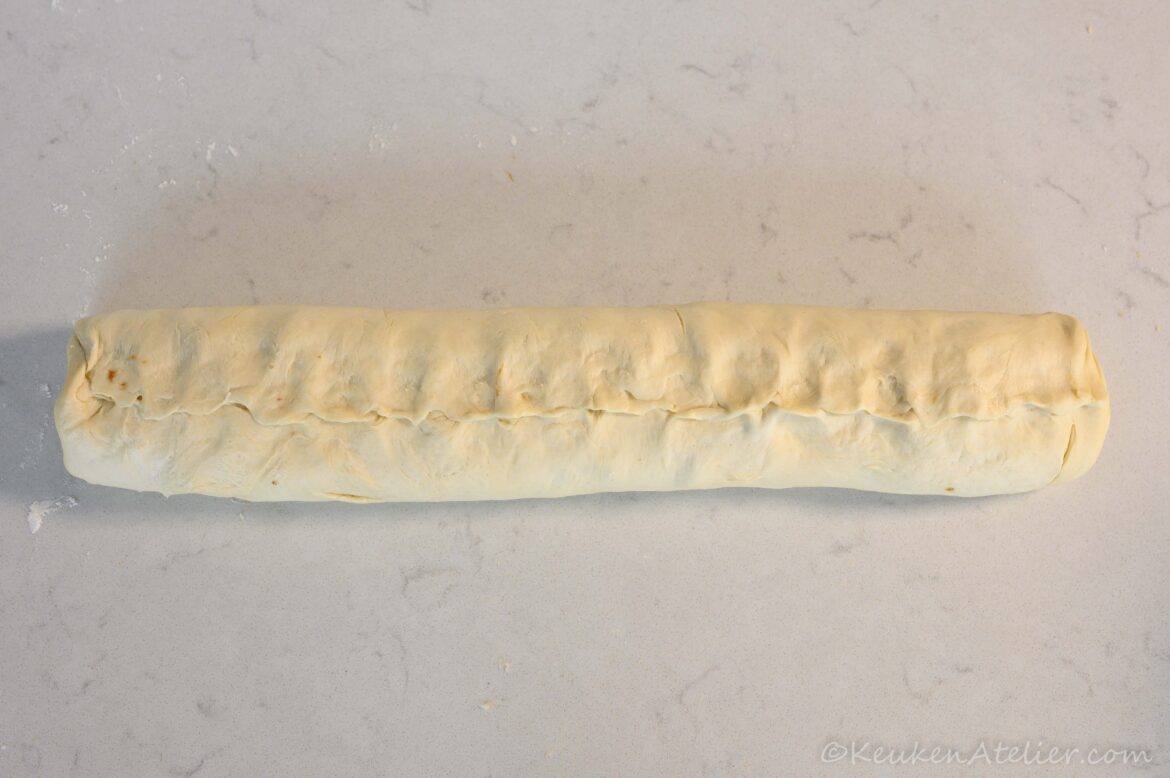 - Begin met het maken van het deeg het liefst een dag eerder (zie stap 2). Doe voor het deeg alle ingrediënten, behalve de boter, in de kom van de keukenmachine die is voorzien van deeghaak. Kneed alles gedurende 5 minuten tot een samenhangend deeg. Voeg dan de zachte boter toe en kneed deze door het deeg. Het kneden duurt in totaal ongeveer 10 minuten, tot je een glanzend deeg hebt dat loslaat van de kom. Het kneden kan uiteraard ook zonder machine, met de hand.