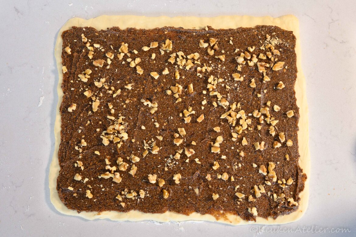 - Bestuif het aanrecht met bloem en rol het deeg uit tot een rechthoek van 30x40 cm. Schep de dadelpasta op het deeg en smeer deze gelijkmatig uit. Laat hierbij 2 cm vrij aan de randen. Strooi er tot slot de gehakte walnoten over en rol het deeg op vanaf één van de lange zijden. Probeer de beide uiteinden van de rol terug naar binnen te duwen als deze tijdens het oprollen naar buiten steken. Sluit de deegrol door de naad goed dicht te drukken.