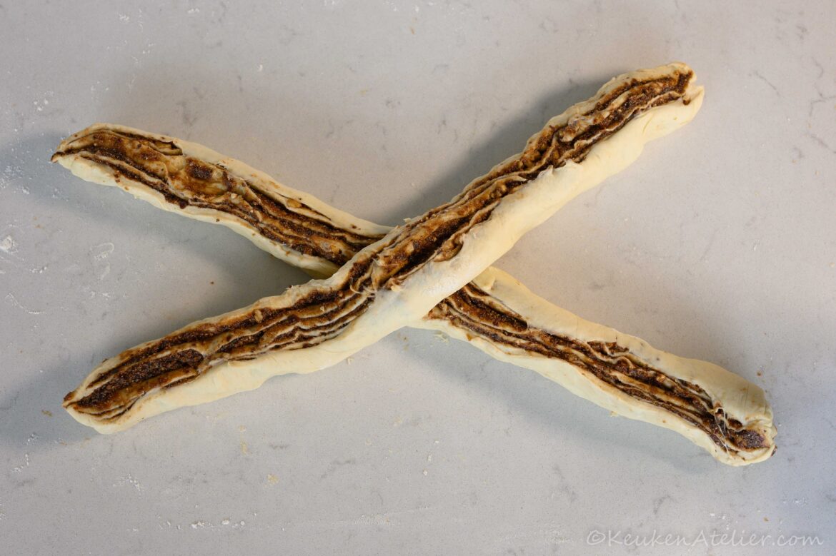 - Leg de naad naar onderen en snijd de rol overlangs doormidden. Leg de twee helften, met de snijkant naar boven, gekruist als een "X" (zie foto). Draai, aan elke kant van het kruispunt, de "benen van de X" om elkaar heen zodat je eindigt met een soort "wokkel" (zie foto). Zorg dat deze wokkel de lengte heeft van de cakevorm door hem eventueel iets in te duwen of uit te rekken. Til hem dan voorzichtig over in de cakevorm.