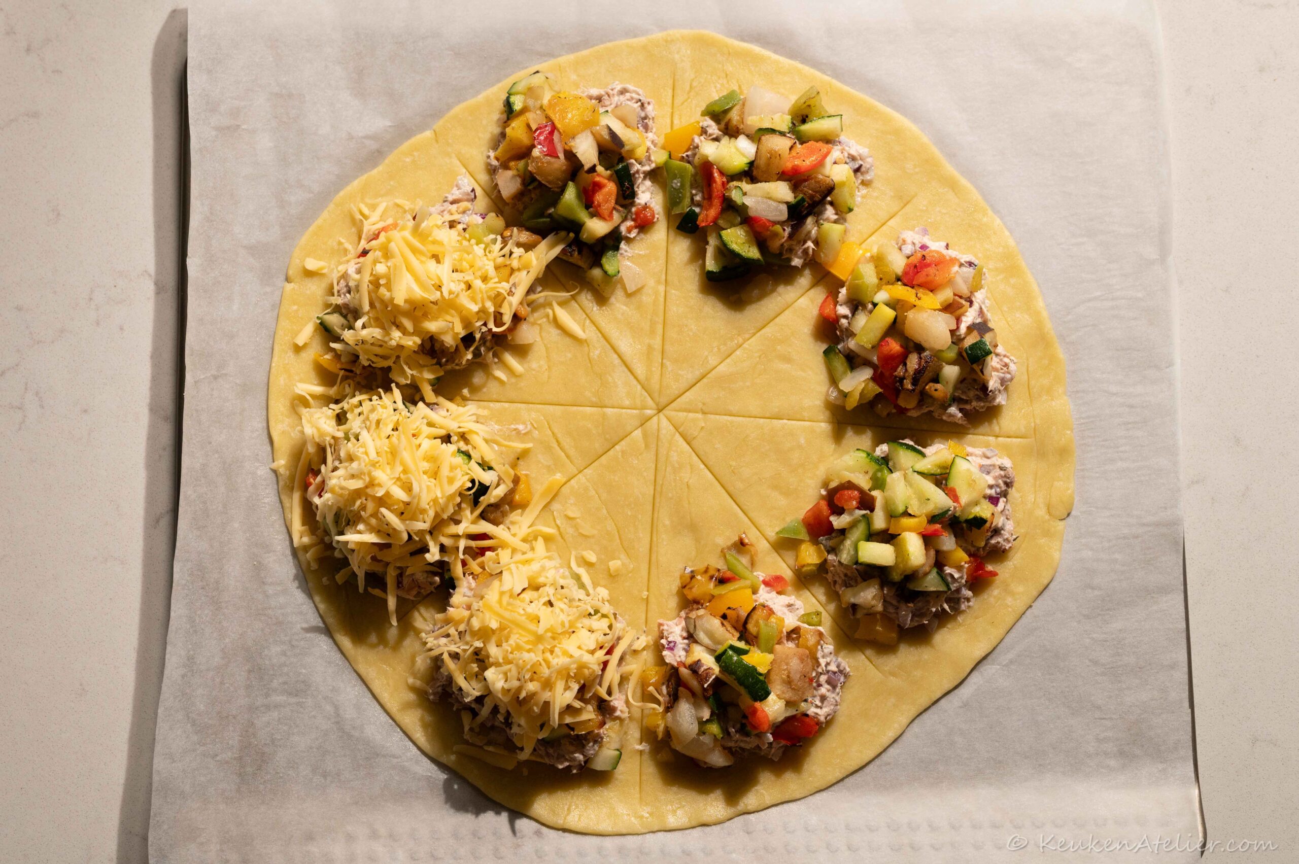 - Leg het ronde quichedeeg op het bijbehorende bakpapier op een bakplaat. Verdeel het deeg in 8 punten maar snijd het deeg niet verder in dan tot 2-3 cm van de rand (zie foto). Verdeel het tonijnmengsel over de 8 punten zoals op de foto. Laat ook hierbij de randen vrij en een groot deel van de punten (zie foto). Leg de gehakte groenten op de tonijn en verdeel vervolgens de geraspte kaas erover.